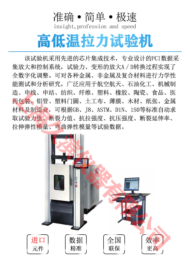 高低溫鋁合金試驗機采用的芯片集成技術(shù),專業(yè)設(shè)計的PCI數(shù)據(jù)采集放大和控制系統(tǒng),試驗力、變形的放在A/D轉(zhuǎn)換過程實現(xiàn)了全數(shù)字化調(diào)整??蓪Ω鞣N金屬、非金屬及復(fù)合材料進(jìn)行力學(xué)性能測試和分析研究,廣泛應(yīng)用于航空航天、石油化工、機械制造、申線、申結(jié)、紡織、纖維、塑料、橡膠、陶瓷、食品、醫(yī)藥包裝、鋁管、塑料門圖、土工布、薄膜、木材、紙張、金屬材料及制造業(yè),可根據(jù)GB、JB、ASTM,D1N、1SO等標(biāo)準(zhǔn)自動求取zuì大試驗力值、斷裂力值、抗拉強度、抗壓強度等試驗數(shù)據(jù)。