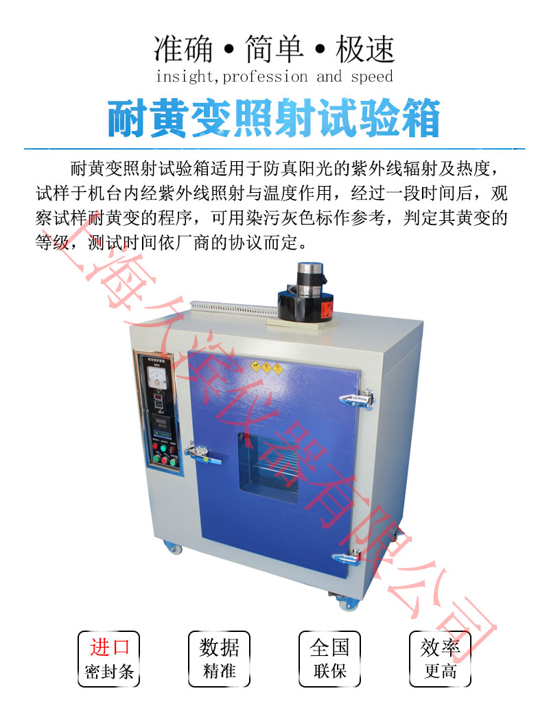 耐黃變照射試驗箱適用于陽光的紫外線輻照及熱度,試樣于機臺內(nèi)經(jīng)紫外線照射與溫度作用,經(jīng)過一段時間后,觀察試樣變的程度,可用染污灰色標(biāo)作參考。