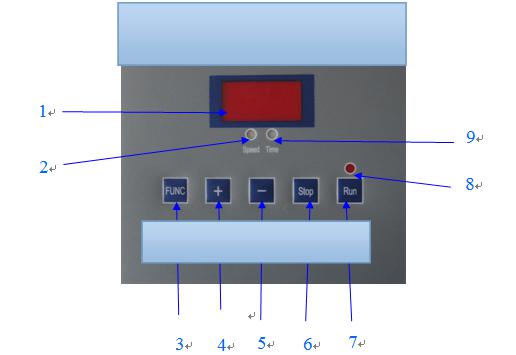 1.數(shù)顯窗 2.轉(zhuǎn)速指示燈 3.功能轉(zhuǎn)換鍵 4. 增加鍵 5.減少鍵 6. 停止鍵 7. 運(yùn)行鍵 8. 運(yùn)行指示燈 9.運(yùn)行時(shí)間指示燈