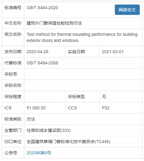 由中國建筑科學研究院有限公司修訂、全國建筑幕墻門窗標準化技術(shù)委員會歸口的國家標準GB/T 8484-2020《建筑外門窗保溫性能檢測方法》于2020年4月28日發(fā)布,2021年3月1日實施。