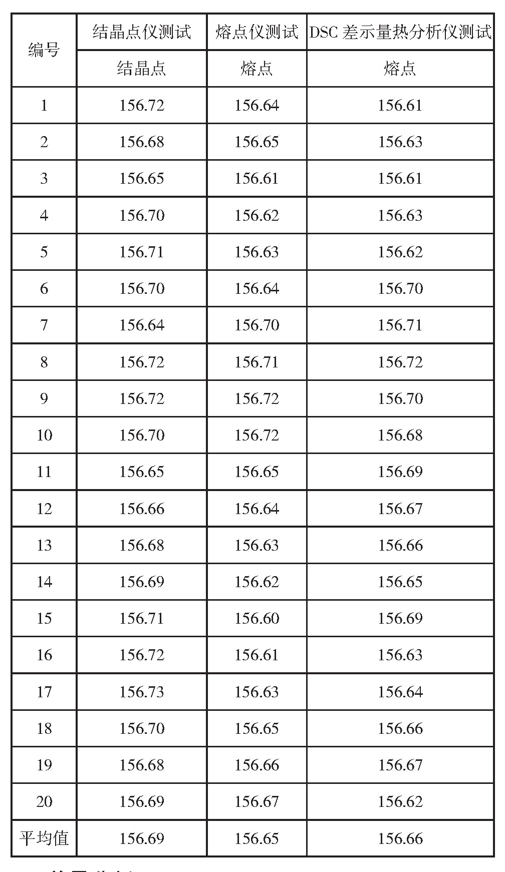 分別將雙酚A樣品分別用熔點儀、結(jié)晶點儀、DSC差示掃描量熱分析儀進(jìn)行測試,對比結(jié)果如表1所示。